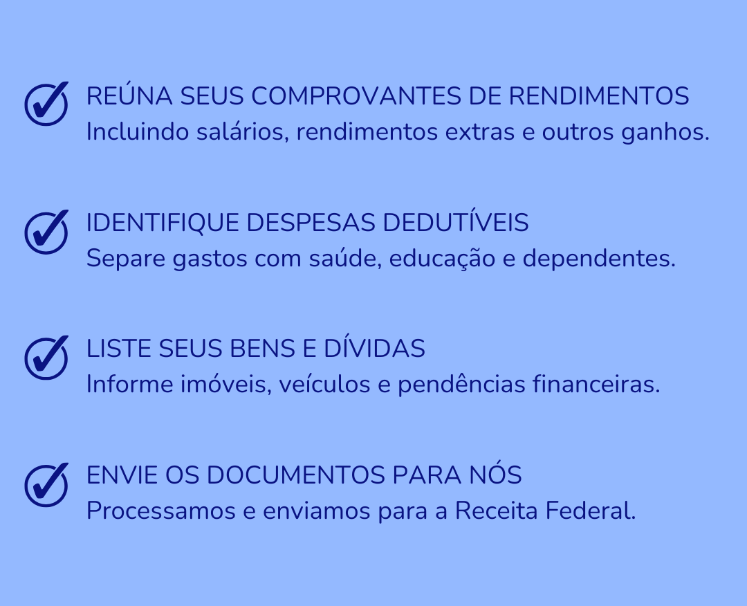 NÓS PREPARAMOS SUA DECLARAÇÃO DE IMPOSTO DE RENDA COM TODOS OS DADOS NECESSÁRIOS, GARANTINDO QUE VOCÊ PAGUE EXATAMENTE O QUE DEVE, SEM ERROS OU SURPRESAS.