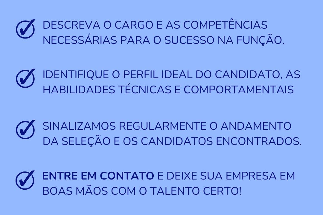 REALIZAMOS RECRUTAMENTO & SELEÇÃO PARA ENCONTRAR CANDIDATOS QUE REALMENTE SE ALINHEM COM AS NECESSIDADES DO SEU NEGÓCIO E COM A CULTURA DA SUA EMPRESA. CUIDAMOS DE TODO O PROCESSO PARA GARANTIR QUE VOCÊ CONTRATE PROFISSIONAIS COMPETENTES, QUE VÃO CONTRIBUIR COM O SUCESSO E O AMBIENTE DO SEU TIME.