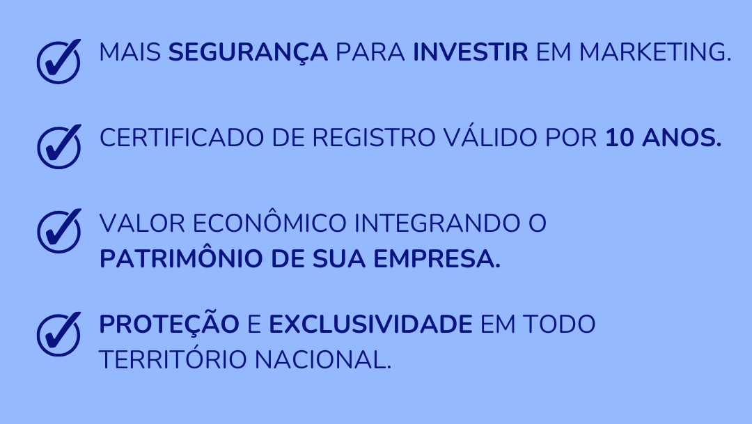 SEM O REGISTRO, SUA MARCA FICA VULNERÁVEL A USOS INDEVIDOS, O QUE PODE COMPROMETER TODO O SEU INVESTIMENTO EM IMAGEM, MARKETING E EXPANSÃO DO NEGÓCIO. COM O REGISTRO, VOCÊ GARANTE A EXCLUSIVIDADE E PROTEÇÃO JURÍDICA DA SUA MARCA E FRANQUEAR SEU NEGÓCIO
