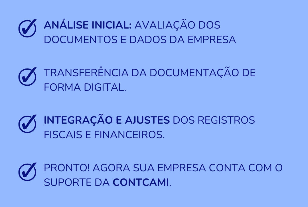 SE VOCÊ ESTÁ BUSCANDO UMA MUDANÇA DE CONTADOR, NOSSA EQUIPE GARANTE QUE A TRANSIÇÃO SEJA TRANQUILA, SEM INTERUPÇÕES NAS OBRIGAÇÕES FISCAIS DA SUA EMPRESA.